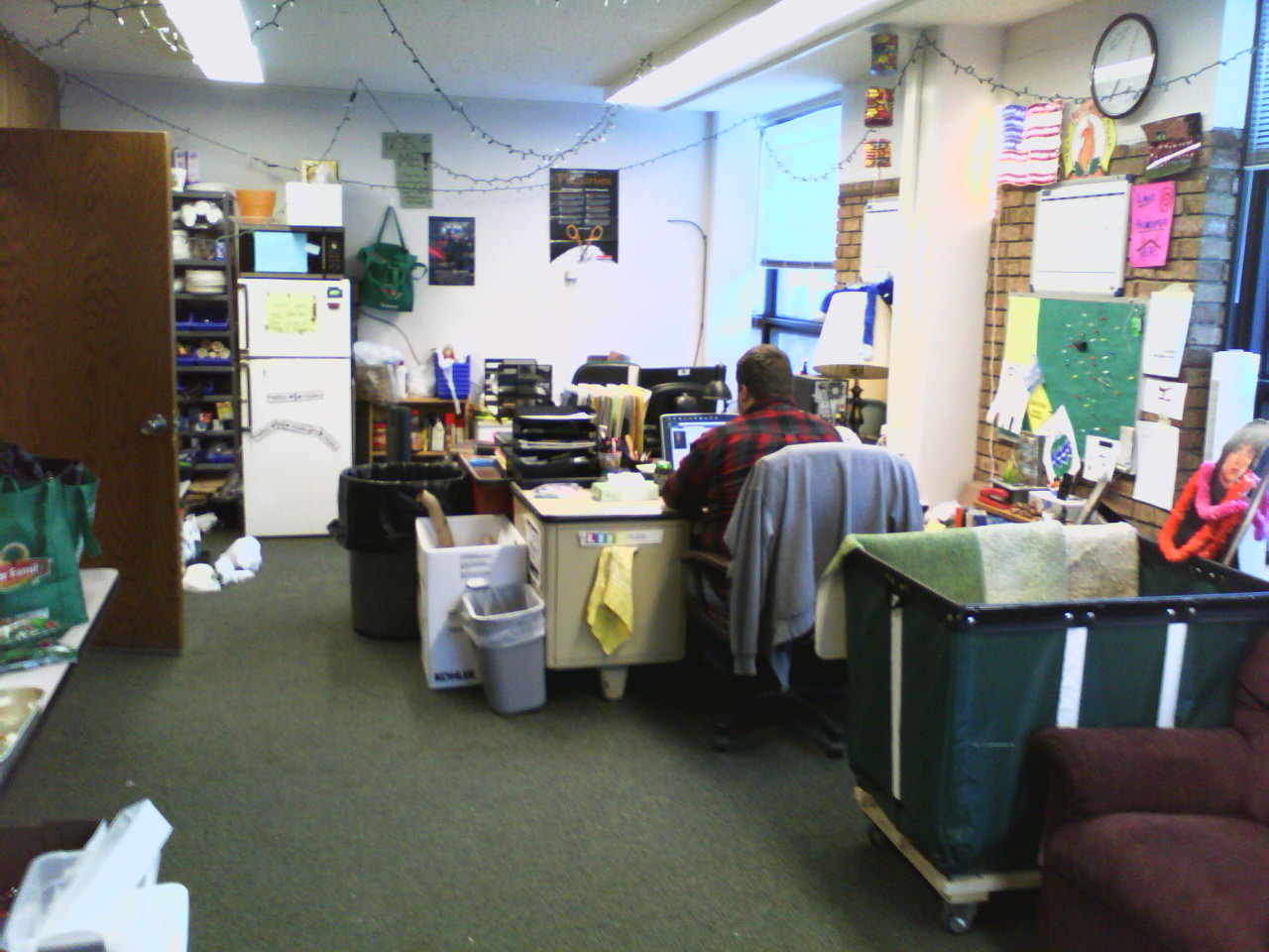 | Charlie Falk works on the computer in the office for Oak Hall staff members. |